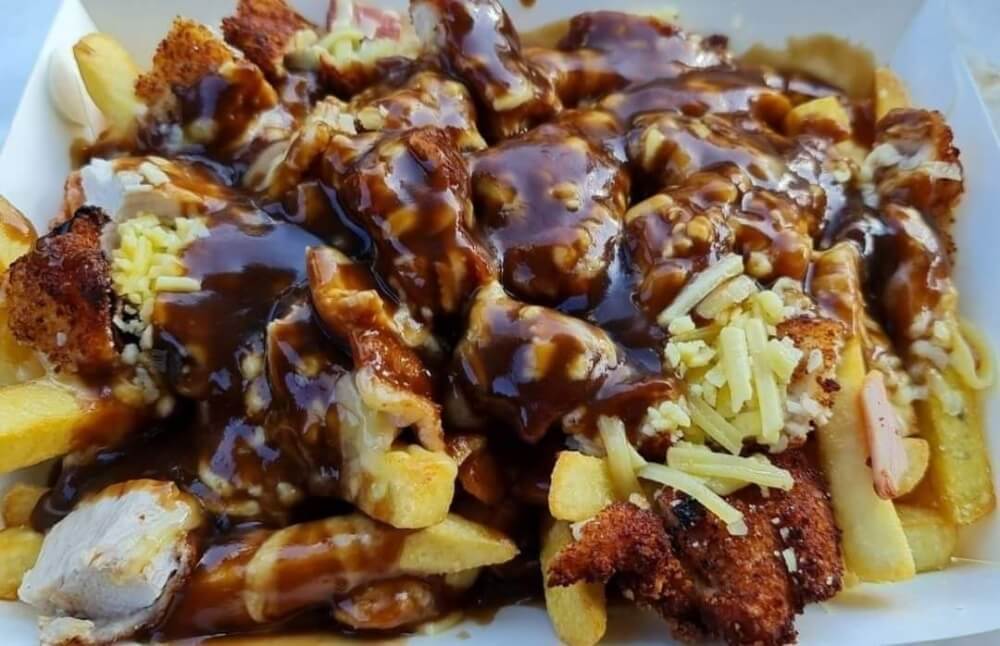 Fries topped with Bacon, Chicken Schnitzel, Cheese and Gravy