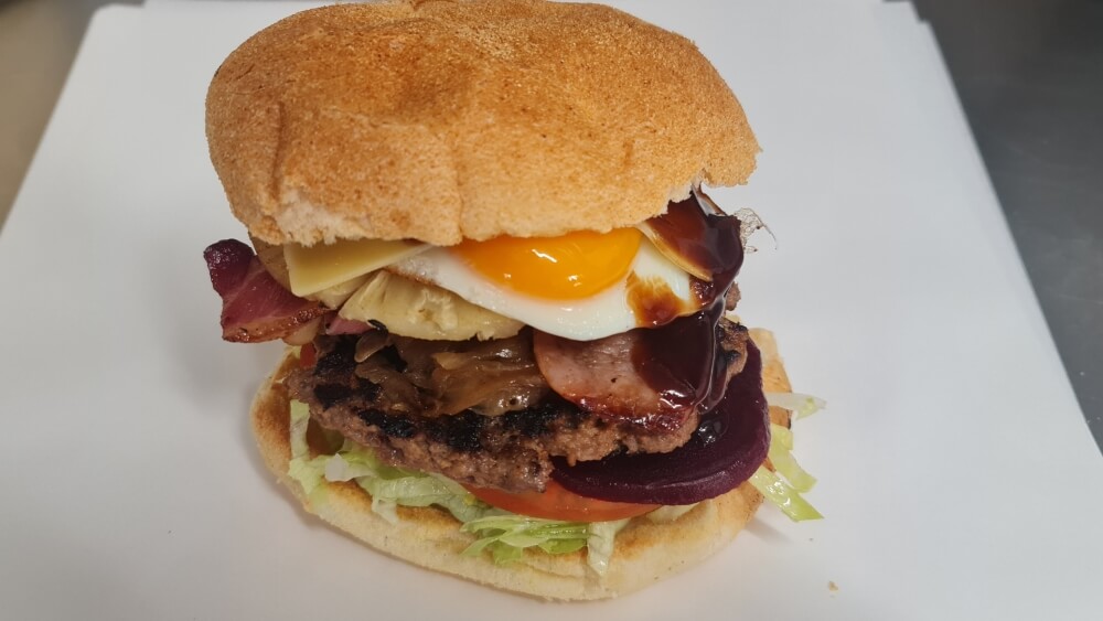 Beef Patty, Onion, Lettuce, Tomato, Beetroot, Bacon, Pineapple, Egg, Cheese and BBQ sce