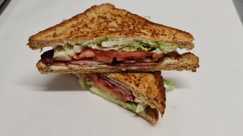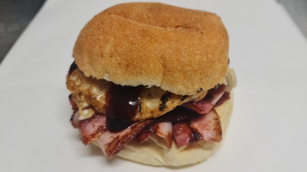 Double bacon, egg , cheese & BBQ sauce on a Turkish roll.