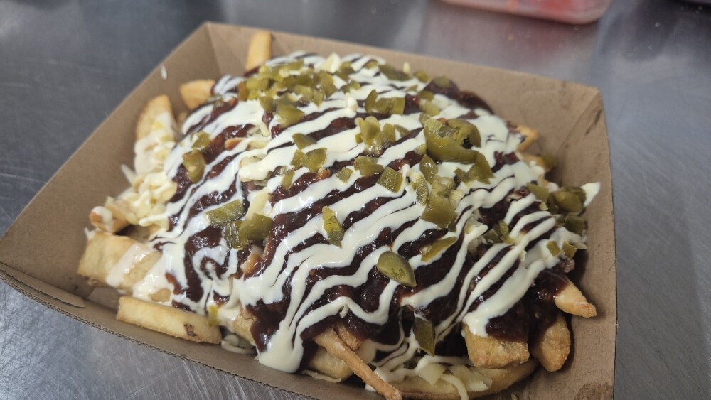 Chips topped with beef patty , cheese, smokey chilli BBQ sauce, sour cream and jalapeños.