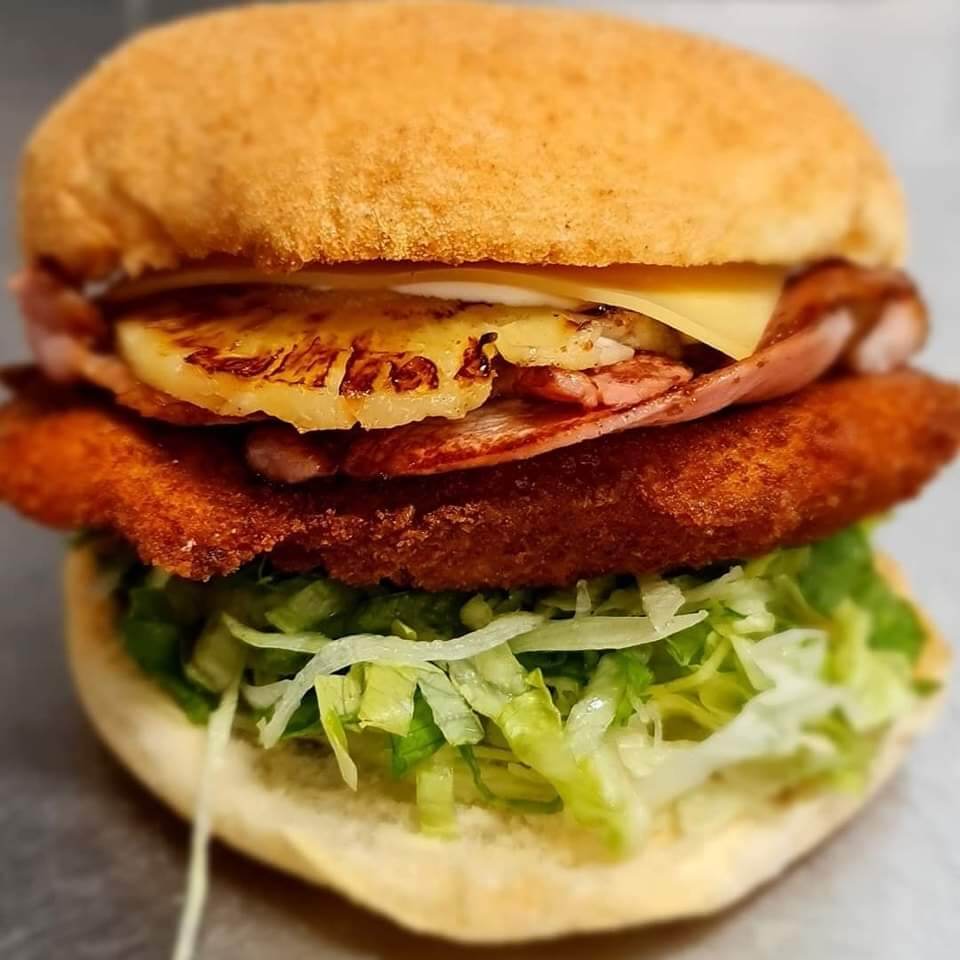 Crumbed Chicken Breast, Lettuce, Bacon, Pineapple, Cheese, Aioli