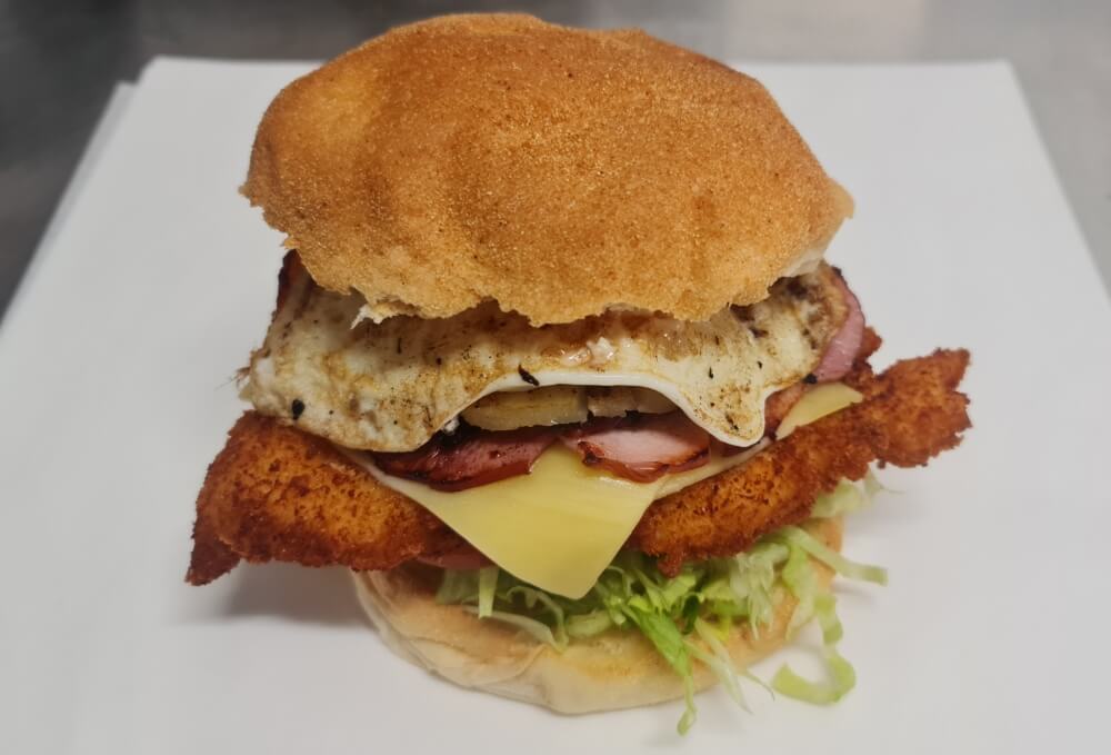 Crumbed Chicken Breast, Lettuce, Tomato, Bacon, Egg, Pineapple, Cheese, mayo
