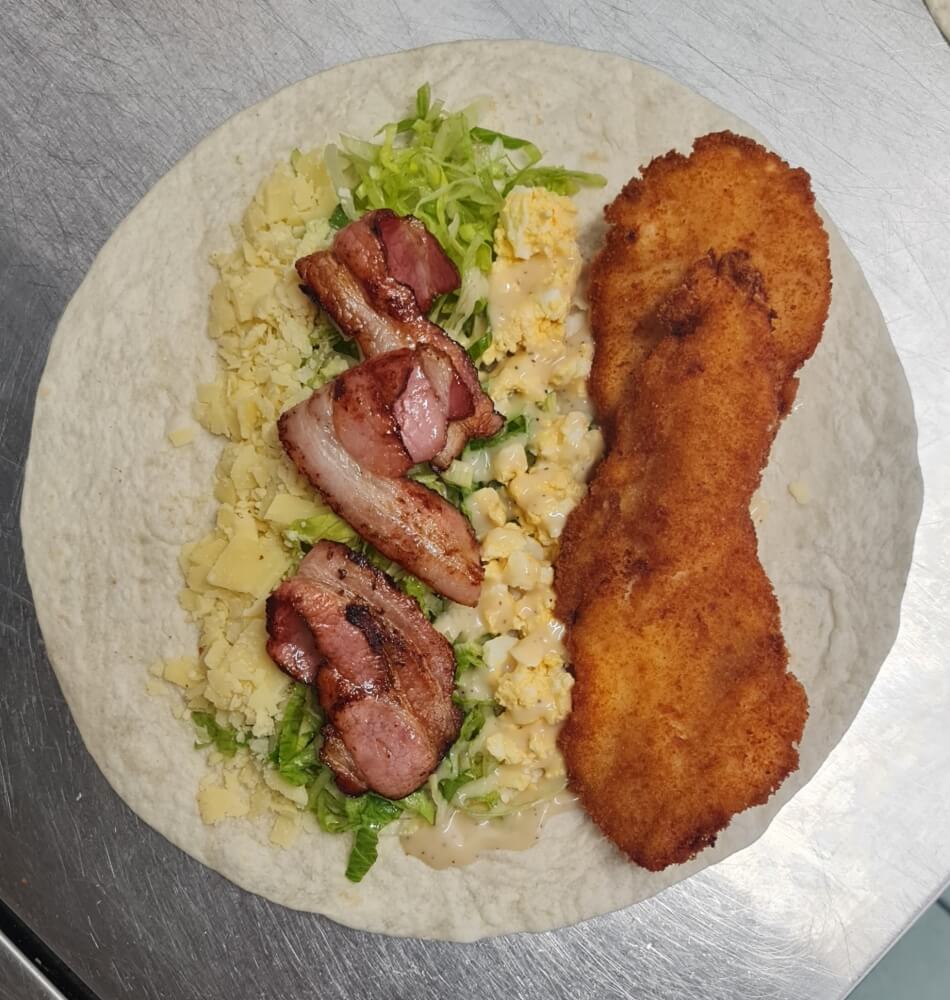 Crumbed Chicken Breast, Lettuce, Bacon, Egg, Parmesan, Caezar Sauce
